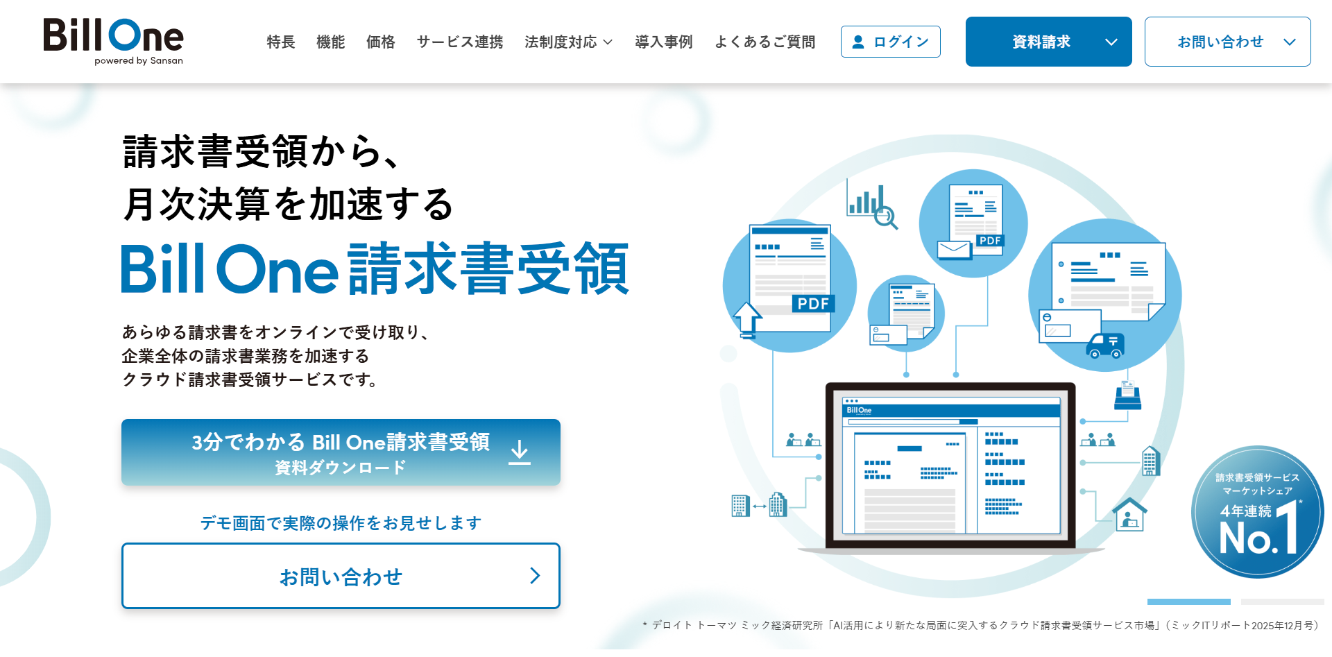 「Bill One」は、Sansanの提供するクラウド請求書受領サービスです。Bill Oneの強みは、紙やメールで届く請求書の受領とスキャンを代行してもらえる点です。受け取る請求書の中で紙の割合が高い企業は検討すべきでしょう。