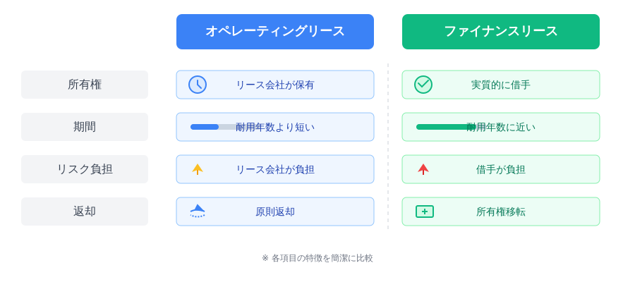 他のリース取引の種類として、ファイナンスリースがあります。違いを以下の図で把握できます。