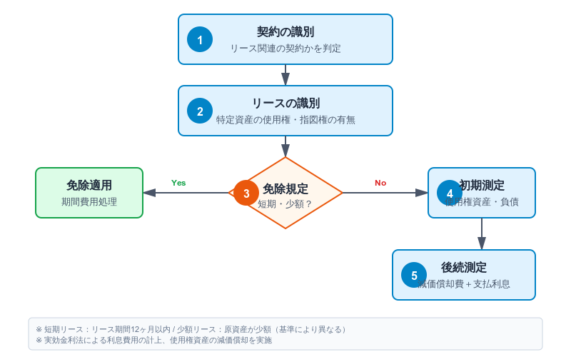 上図のように、オペレーティングリースの会計処理は5つのステップで構成されます。 特に重要なのは③の免除規定の判定で、ここで短期リース・少額リースに該当する場合は 簡便的な処理が認められます。以下、各ステップについて詳しく解説します。