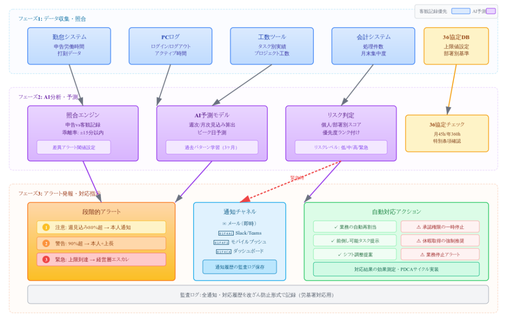 この設計図に示すように、客観的な労働時間の把握から予兆検知、段階的なアラート発報まで、 一連のフローを自動化することで、36協定違反を未然に防ぎながら残業の山を崩すことができます。