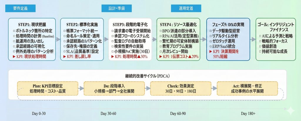 | 月次KPIのベースライン | 1伝票処理時間/差し戻し率/遅延件数/1伝票コスト | □ 未 □ 中 □ 済 |