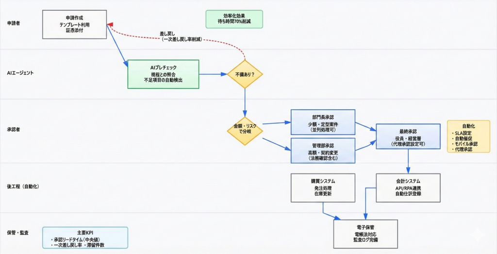 | 〜30万円 | 低(定型/継続) | 既存・与信済み | 申請者 → 部門長 | 部門長と管理職の並列承認可 / 規程充足で管理部スキップ | 24h | AIプレチェック必須項目・証憑OK |