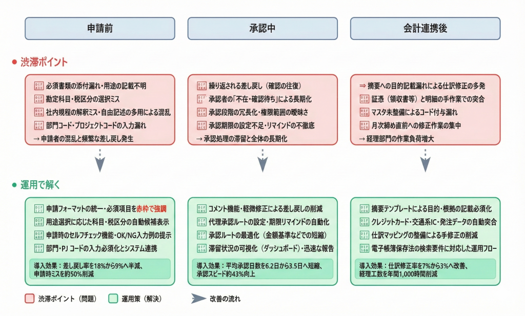 様式の乱立・判断基準の曖昧さ・紙中心の承認が重なると、申請前・承認中・会計連携後の各段階で差し戻しと「上長待ち」が連鎖し、リードタイムが伸び続けます。まず「どこで詰まるか」を特定し、申請前・承認中・会計連携後の各段階で起きる典型パターンを棚卸しします。属人的運用を可視化し、「誰が・何を・いつ・どの基準で」見るかを統一することが出発点です。
