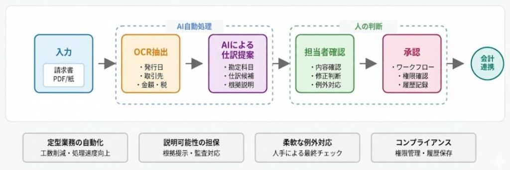 請求書の受領から仕訳候補の提示までをひとつの流れとして設計します。受領方法をメールまたはポータルに統一し、取引先マスタと税区分のルールを先に整えます。AI-OCRで抽出した項目とマスタを照合し、勘定科目・補助科目・税コードの候補を提示します。担当者は根拠を見ながら最終決定を行い、例外はルール化して次回に活かします。