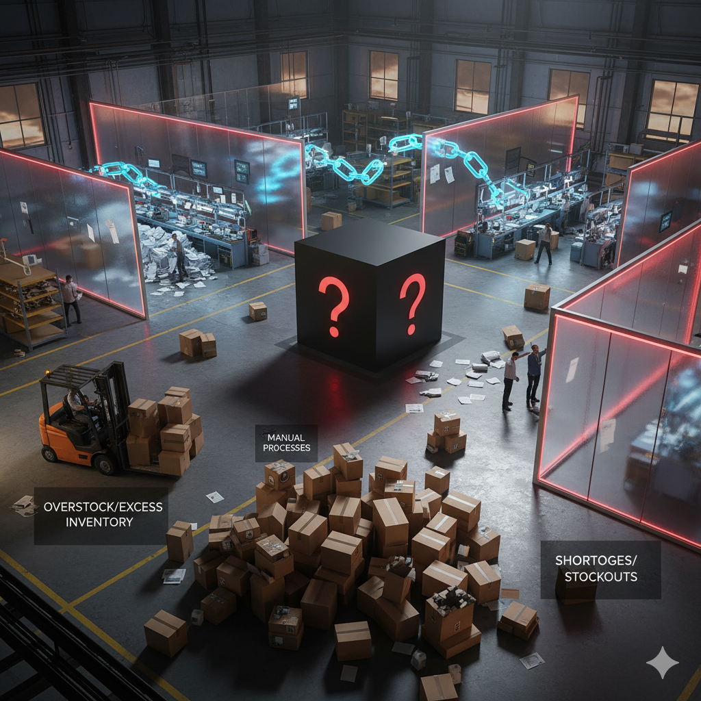 サプライチェーンは、調達、生産、在庫管理、物流、販売といった複数の機能にまたがっており、それぞれが異なるシステムやExcelなどで個別に管理されているケースが散見されます。その結果、自社のサプライチェーン全体で「今、どこに、どれだけの在庫があるのか」「物流コストの内訳はどうなっているのか」といった全体像を、誰もリアルタイムで正確に把握できていない「ブラックボックス化」に陥りがちです。これでは、どこに問題があるのかを特定することすら困難です。