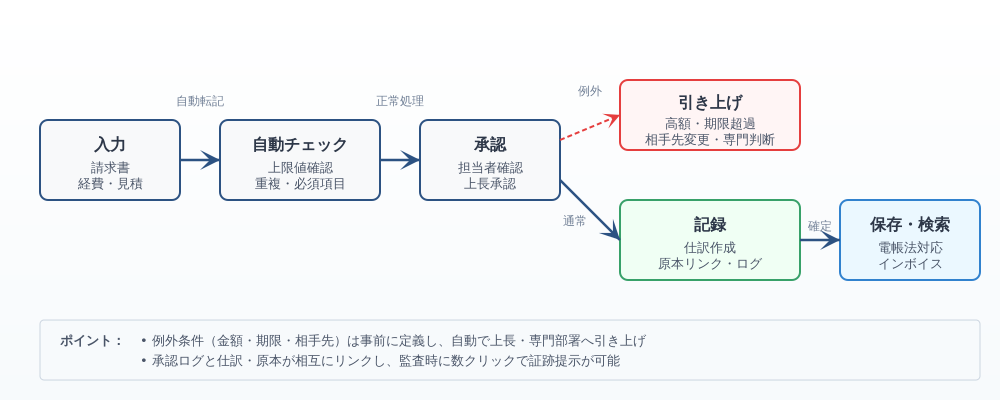 異常値(高額・期限切れ・相手先不一致)は自動で上長や専門部署へ引き上げ、現場が迷わない運用にします。台帳作成と命名規則を先に決めれば、後の自動化や支払管理、資金繰り表との連携が滑らかになり、締め前の滞留を減らせます。