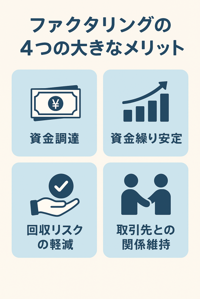 ファクタリングが多くの企業、特に中小企業にとってなぜ魅力的なのか、その具体的なメリットを掘り下げていきましょう。これらの利点は、日々の資金繰りに悩む経理担当者様や経営者様にとって、大きな安心材料となるはずです。