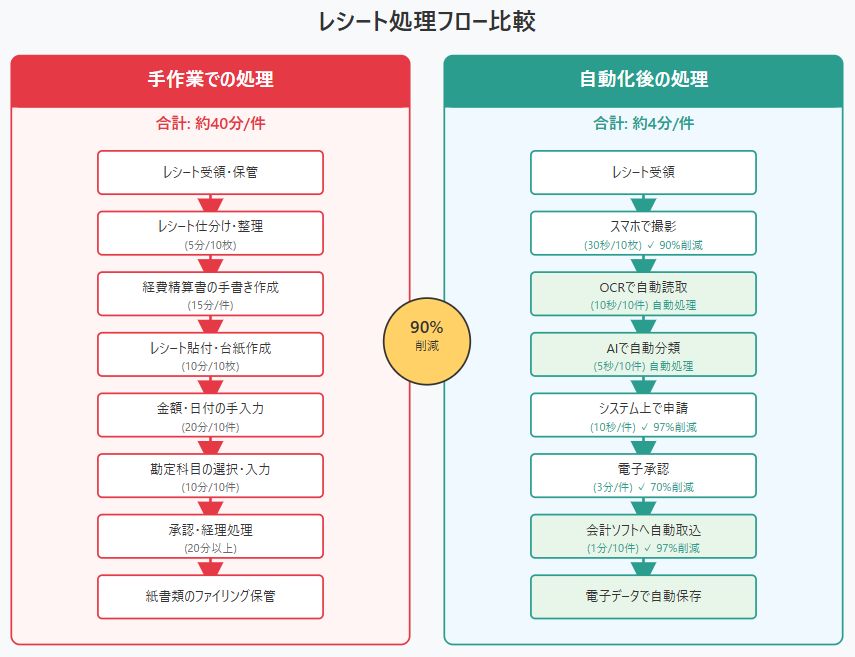 | ① 収集 | 紙レシートを各自で保管し、月末にまとめて提出 | スマホ撮影/メール転送で随時アップロード | 提出漏れ・紛失を抑制、月末集中を緩和 |