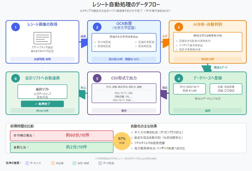 | ⑧ 記帳 | 会計ソフトに手入力で転記 | CSV/APIで一括取込、勘定科目の候補を自動反映 | 転記ミス削減、月次締めの前倒し |