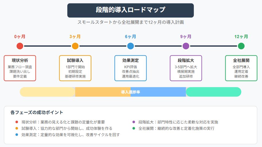 展開規模は、段階的に拡大していくことが基本です。最初の3ヶ月で1部門(全体の10%から20%)、次の3ヶ月で3部門(全体の50%)、その後3ヶ月で全社展開という形で、徐々にペースを上げていきます。各段階で得られた知見を次の展開に活かし、問題があれば立ち止まって改善してから進むという柔軟性を持つことが、最終的な成功につながります。