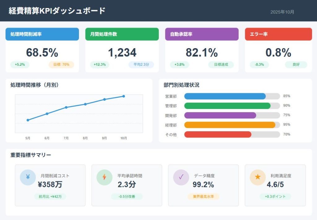 AI導入の効果を正確に把握するためには、多面的なKPI設定が必要です。業務効率に関するKPIとして、経費申請から承認完了までの平均処理時間、月次締め処理にかかる総時間、一件あたりの処理コスト、自動承認率、エラー発生率の5つを設定します。これらは週次で測定し、トレンドを把握することで、システムの稼働状況を継続的にモニタリングします。処理時間は申請時刻と承認完了時刻の差分から自動算出し、ダッシュボードでリアルタイムに確認できるようにします。以下の図は、KPIダッシュボードの見本となりますので参考にしてください。