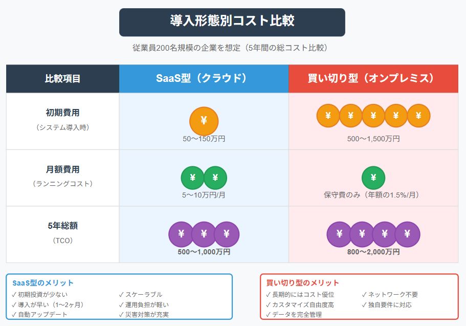 選択の判断基準としては、企業規模、IT人材の有無、セキュリティ要件、カスタマイズの必要性などを総合的に検討する必要があります。一般的に、従業員200名以下の中小企業ではSaaS型が、それ以上の規模で独自要件が多い企業では買い切り型が選択されるケースが多く見られます。