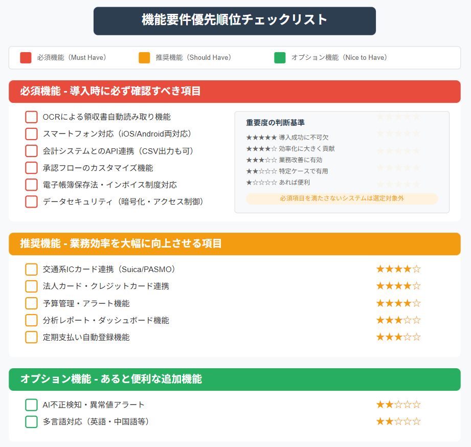 付加機能については、導入後の拡張性を考慮して評価します。予算管理機能、プロジェクト別集計、交通系ICカードとの連携、法人カードとの自動連携など、将来的に活用したい機能がロードマップに含まれているかを確認します。ただし、初期導入時にすべての機能を使おうとすると複雑になりすぎるため、段階的に機能を追加できる柔軟性があることが重要です。