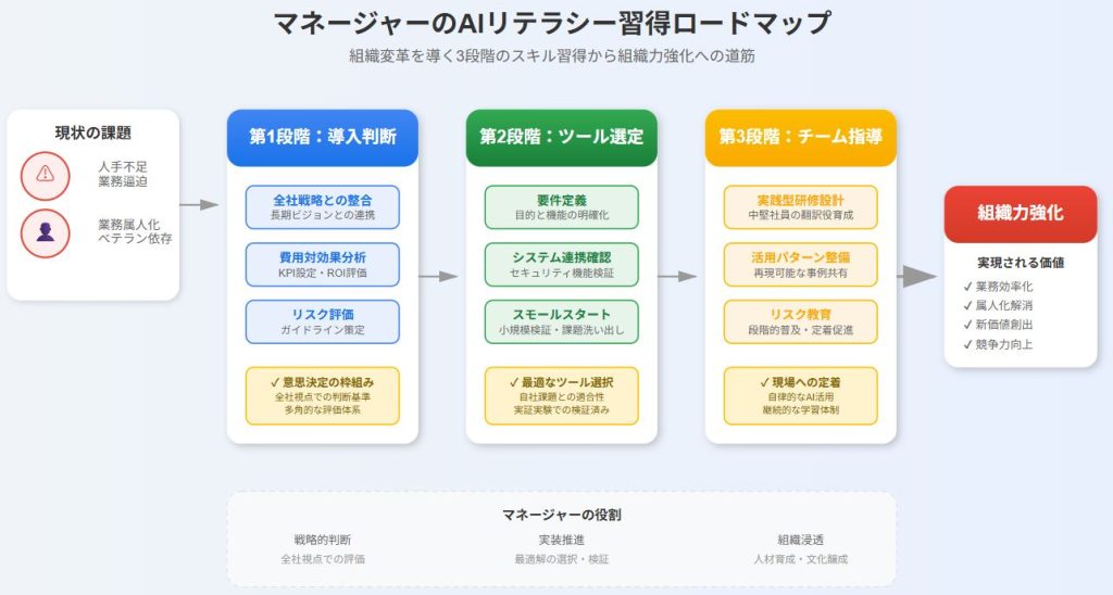 AIを活用して組織を変革するためには、技術を理解するだけでなく、経営戦略と結びつけた総合的なリテラシーが必要です。特にマネージャーが身につけるべきAIリテラシーは、「AI導入の判断」「ツールの選定」「チームへの指導」という3段階で捉えることができます 。