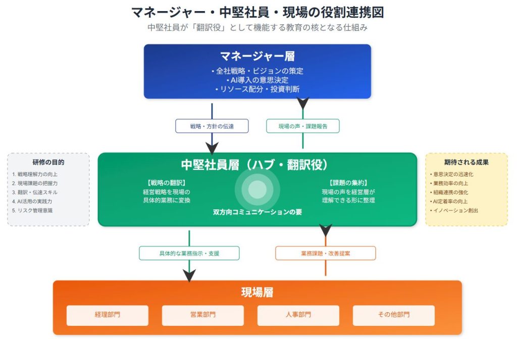 AIツールを組織全体に定着させるためには、単発の操作研修で終わらせず、段階的かつ実践的な内容で設計することが重要です 。特に、現場の状況と経営層の意図の両方を理解できる中堅社員は、AI活用の成功において「翻訳役」という重要な役割を担います。この層を対象とした研修を充実させることが、組織全体への波及効果を高めます 。