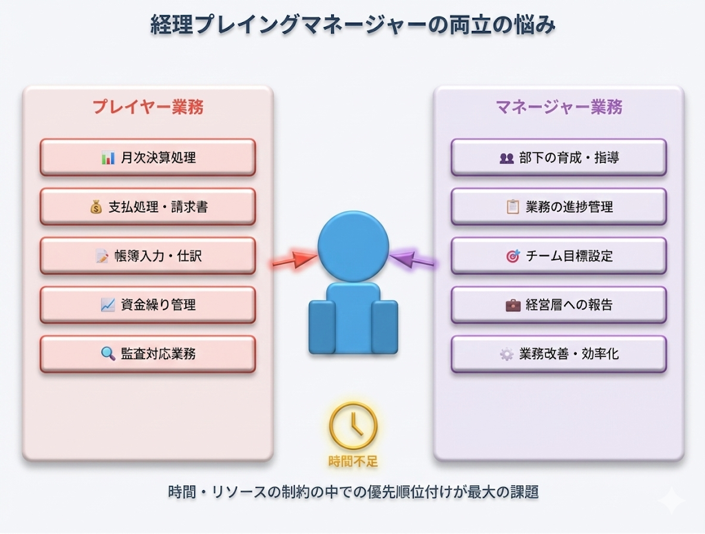 本記事では、経理・バックオフィスならではの事情を踏まえつつ、現場とマネジメントを無理なく両立させるための考え方と、業務の整理・自動化の進め方を整理します。