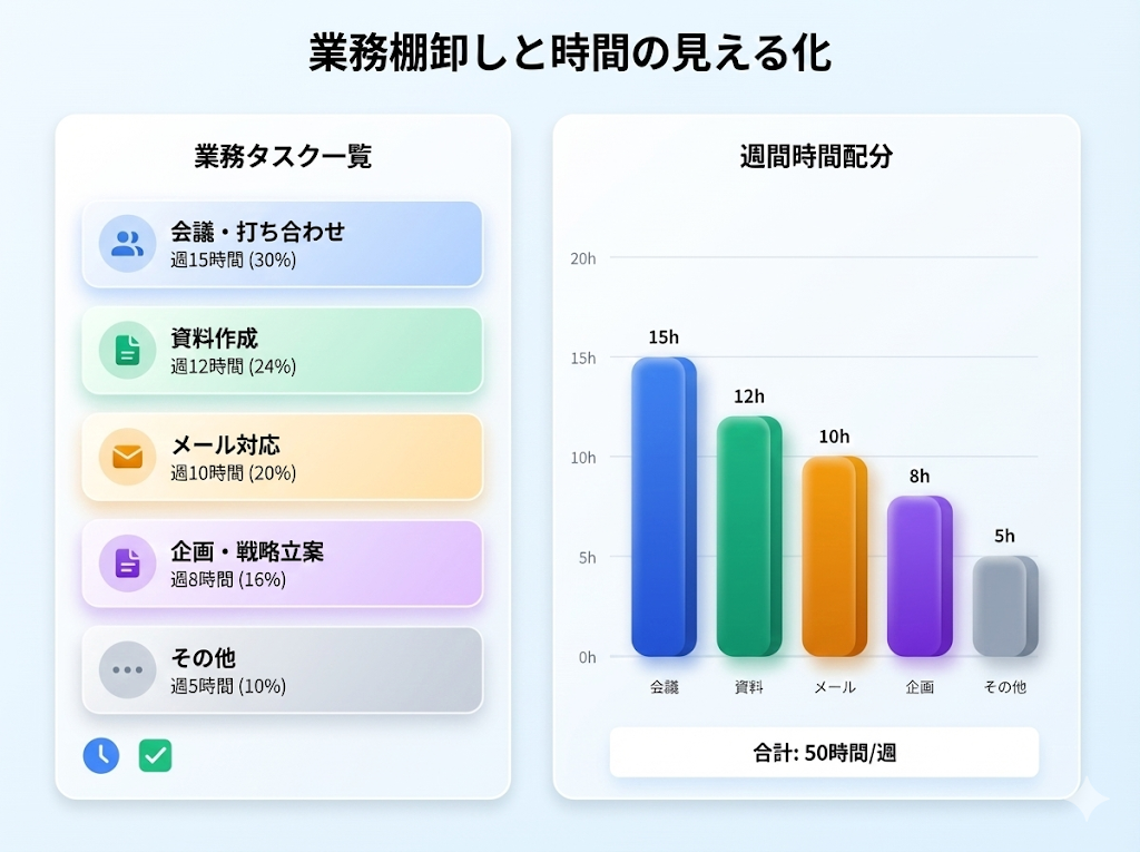| 経営会議向けレポート作成 | Communication(報告・対話) | 月次~四半期 | 毎月◯時間 |