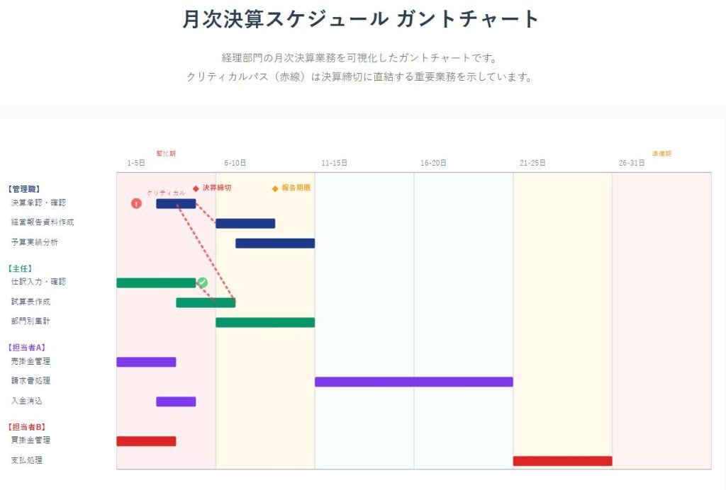 | Do:決算作業実施 | 計画に沿って、仕訳入力、残高確認、試算表作成、各種帳票の出力・確認などの決算実務を進める。 | 進捗状況をこまめに確認し、遅れが出ているタスクには応援を振り向けるなど、現場で柔軟に調整する。 |
