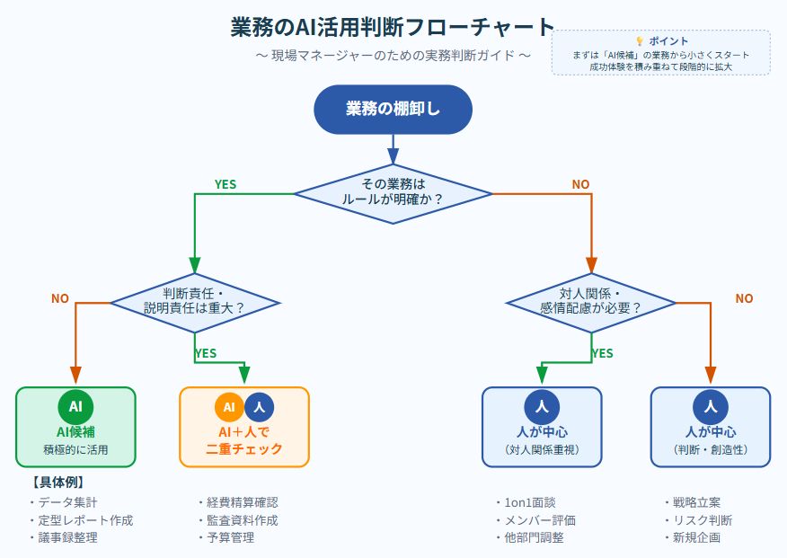 業務の棚卸しと「任せる・一緒にやる・人が担う」という3つの視点を押さえたうえで、実際の現場では「この業務はAI候補なのか、それとも人が中心なのか」を一つひとつ判断していく必要があります。そこで、日々の業務を見直す際のたたき台として、ルールの明確さや判断責任の重さ、対人配慮の有無といった観点から、AI活用の向き・不向きを簡単に整理できるフローチャートを以下に用意しましたので参考にしてください。