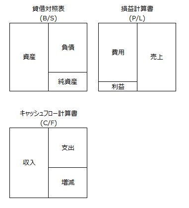 財務3表とは「貸借対照表(B/S)」「損益計算書(P/L)」「キャッシュフロー計算書(C/F)」に分けられます。表にすると以下のようになります。