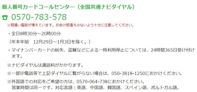 - 個人番号カードコールセンター(全国共通ナビダイヤル)へ電話をし、マイナンバーの利用を一時的に止める