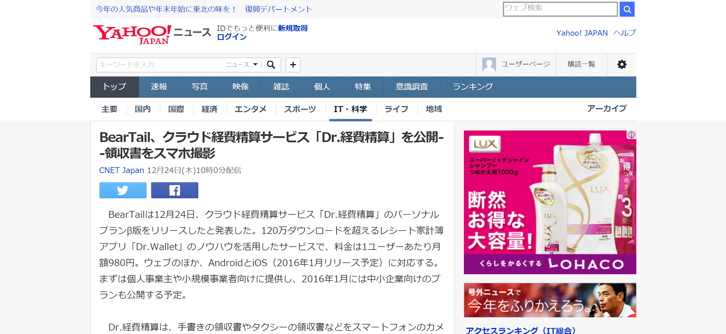 株式会社BearTail(本社:東京都千代田区、代表取締役社長:黒崎賢一)が12月24日より提供を開始した、「クラウド経費精算サービス[Dr.経費精算]」が、 YAHOO! JAPAN ニュース にてご掲載いただきました。 …