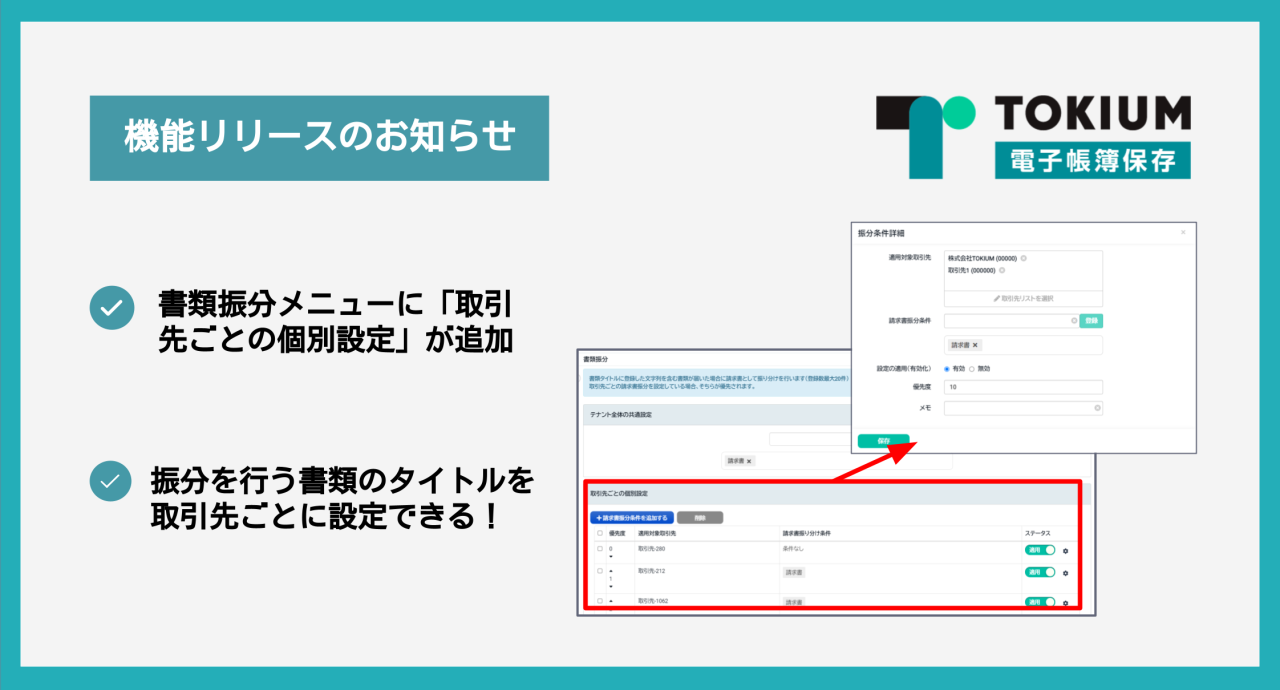 機能追加【TOKIUM電子帳簿保存 機能アップデート】取引先ごとの書類振分が可能に