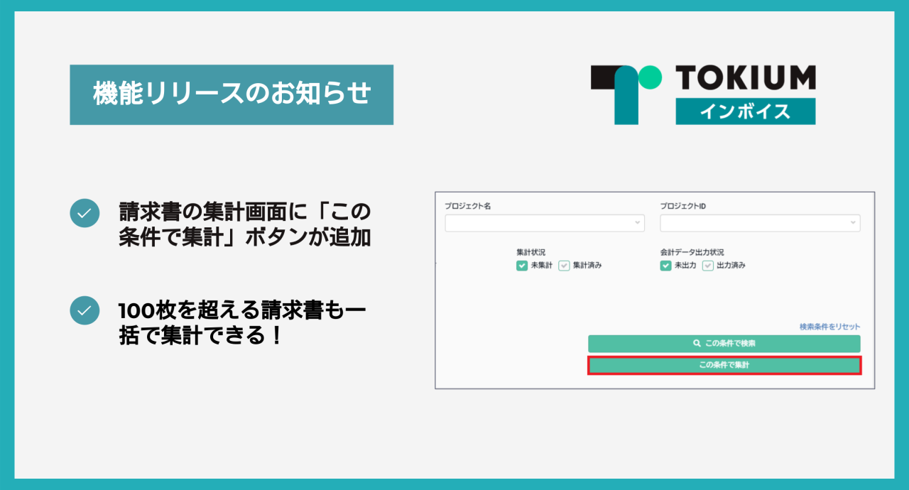 機能追加【TOKIUMインボイス 機能アップデート】集計画面に「この条件で集計」ボタンが追加