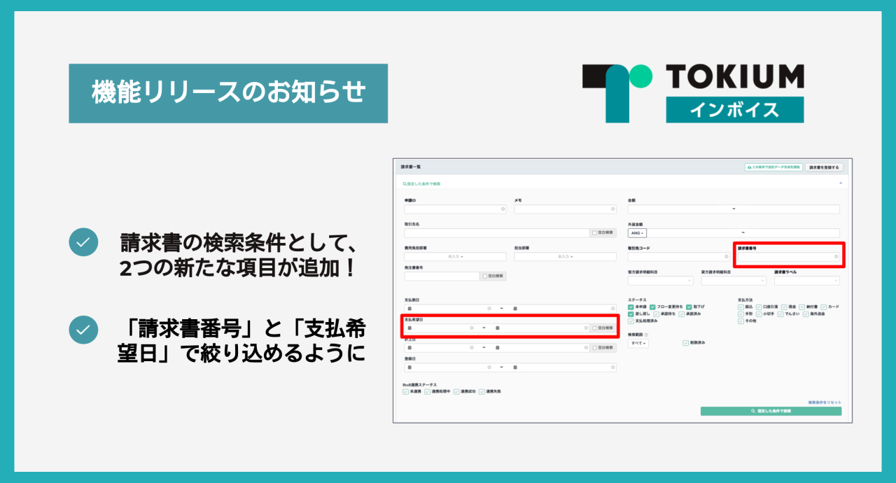 機能追加【TOKIUMインボイス 機能アップデート】請求書一覧の検索条件追加