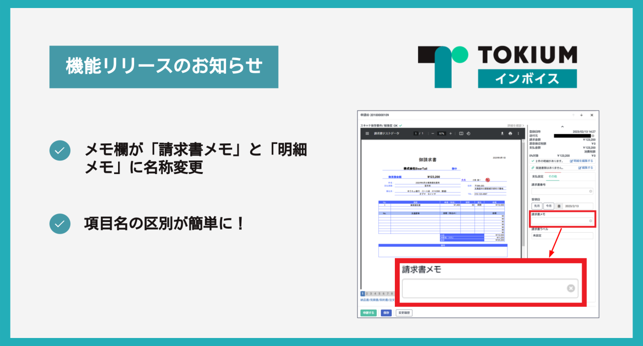 機能追加【TOKIUMインボイス 機能アップデート】請求書と請求書明細における「メモ」欄の名称変更