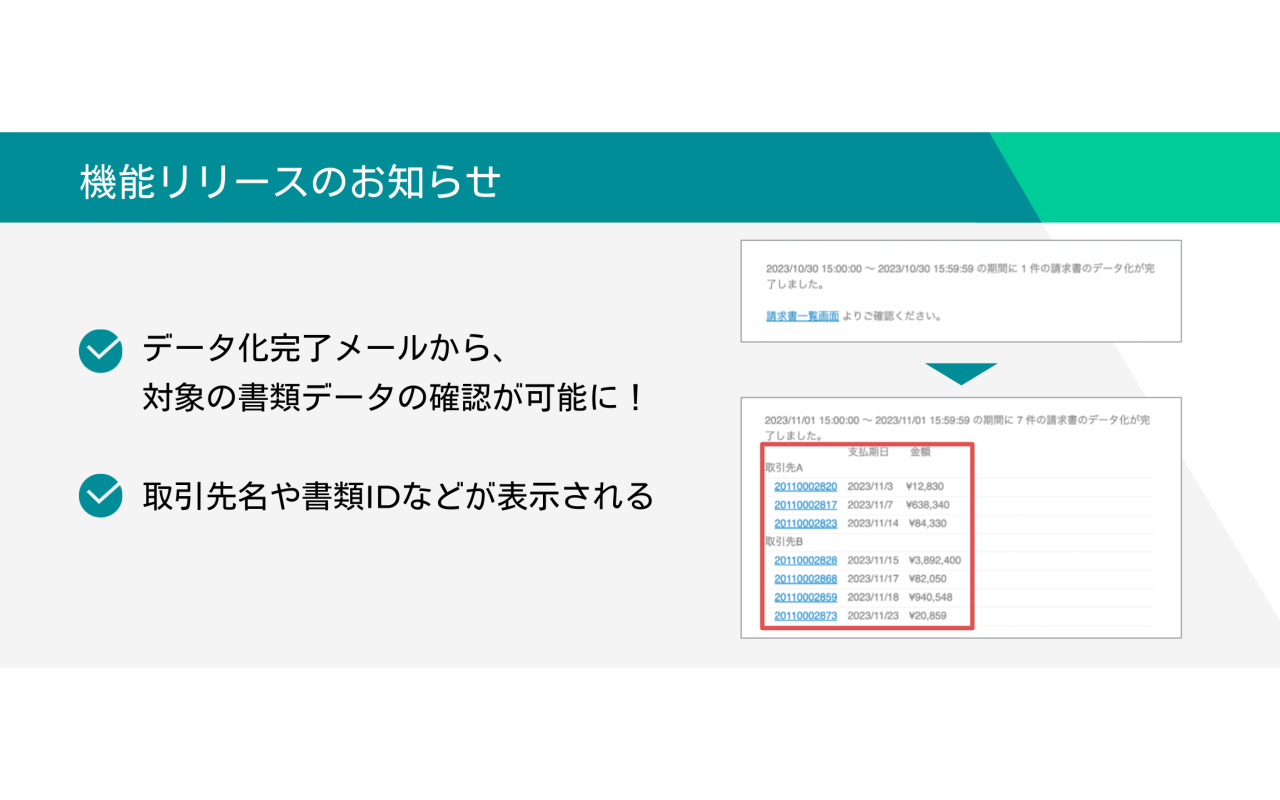 データ化完了メール通知にて、対象の請求書または国税関係書類データの情報を確認できるようになりました。