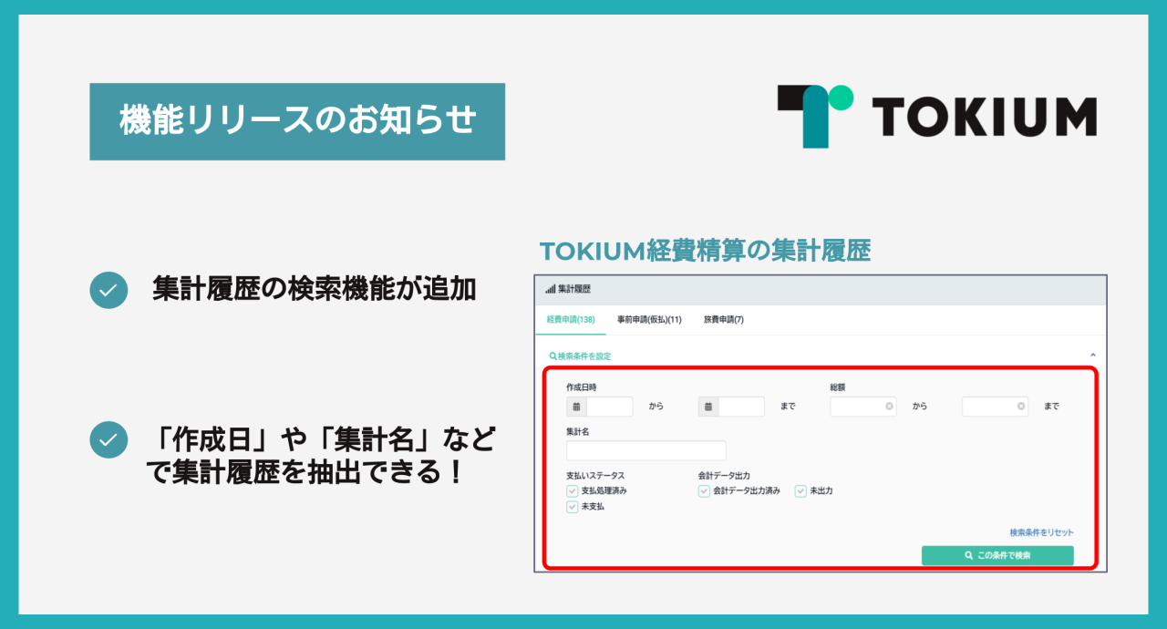 機能追加【TOKIUM 機能アップデート】集計履歴の検索機能が追加