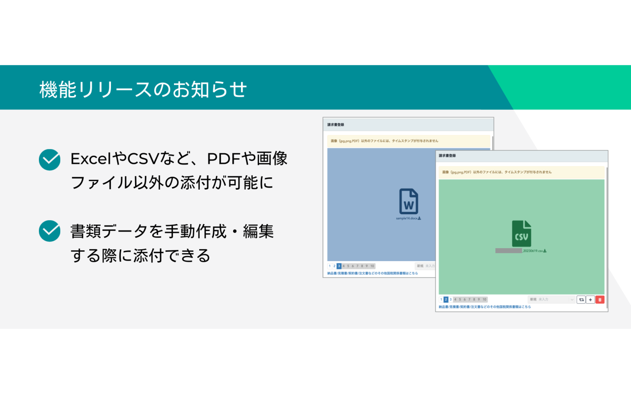これまで請求書と国税関係書類、稟議データには、画像ファイル(PDF・JPG・PNG形式)のみ添付可能でしたが、以下の拡張子も添付できるようになりました。