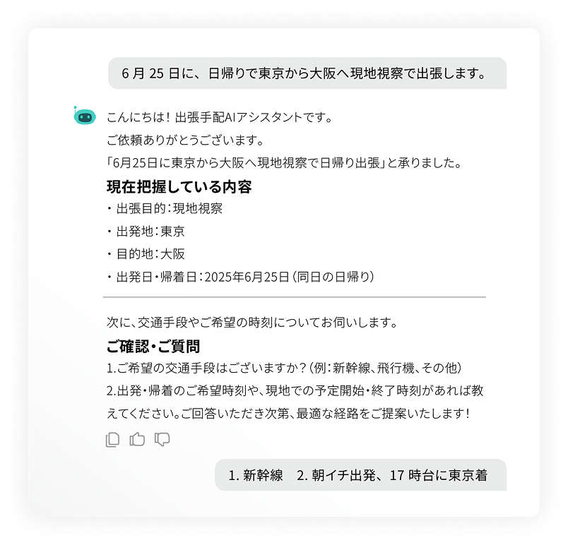行き先と日程をチャットで送るだけで、AIが申請要否を判定