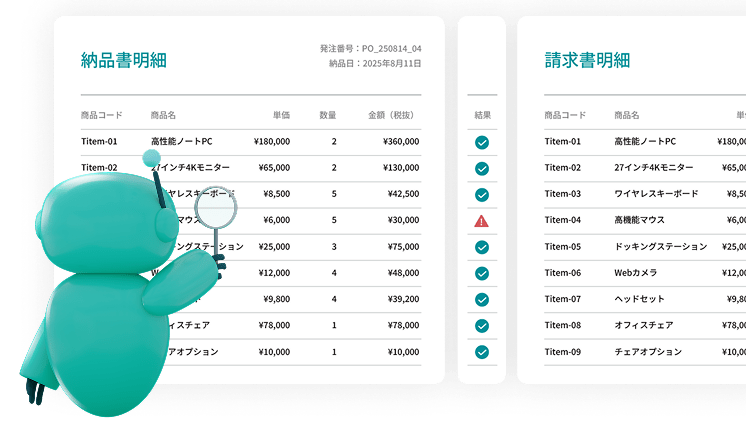 AIが即座に突合を行い、差異を原本リンク付き一覧で納品します。 AIが差異部分の候補を提案するため、目検作業の工数を大幅に削減します。