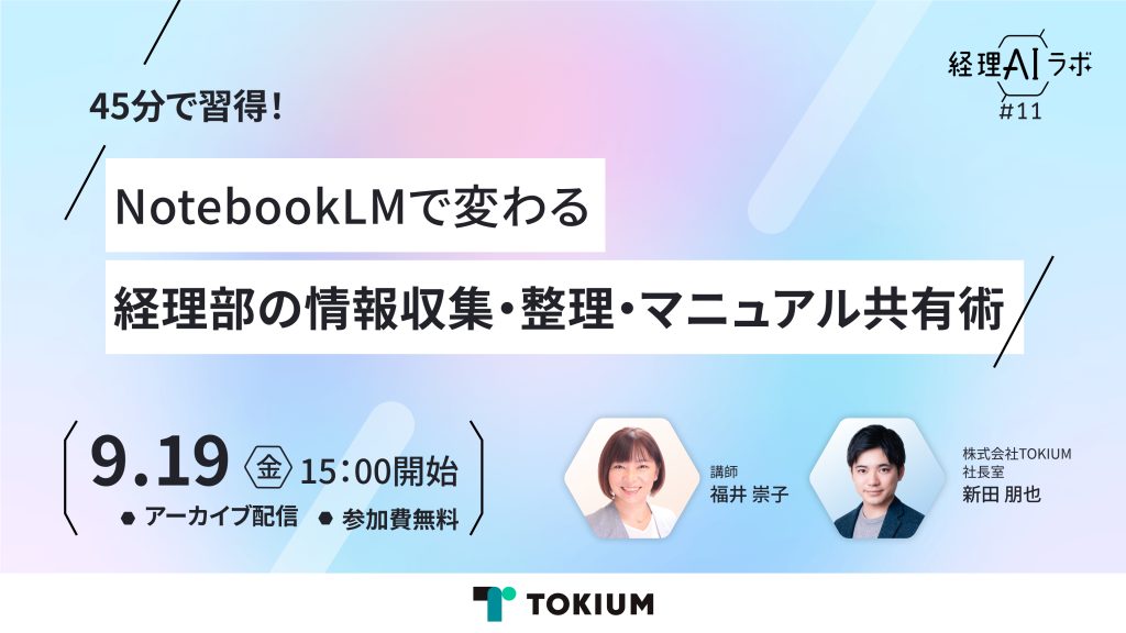 ※9月19日(金)12:15~13:00ライブセミナー「【経理AIラボ】45分で習得!NotebookLMで変わる「経理部の情報収集・整理・マニュアル共有術」」は好評につき満席となりました。本セミナーは同日15:00~アーカイブ配信となります。